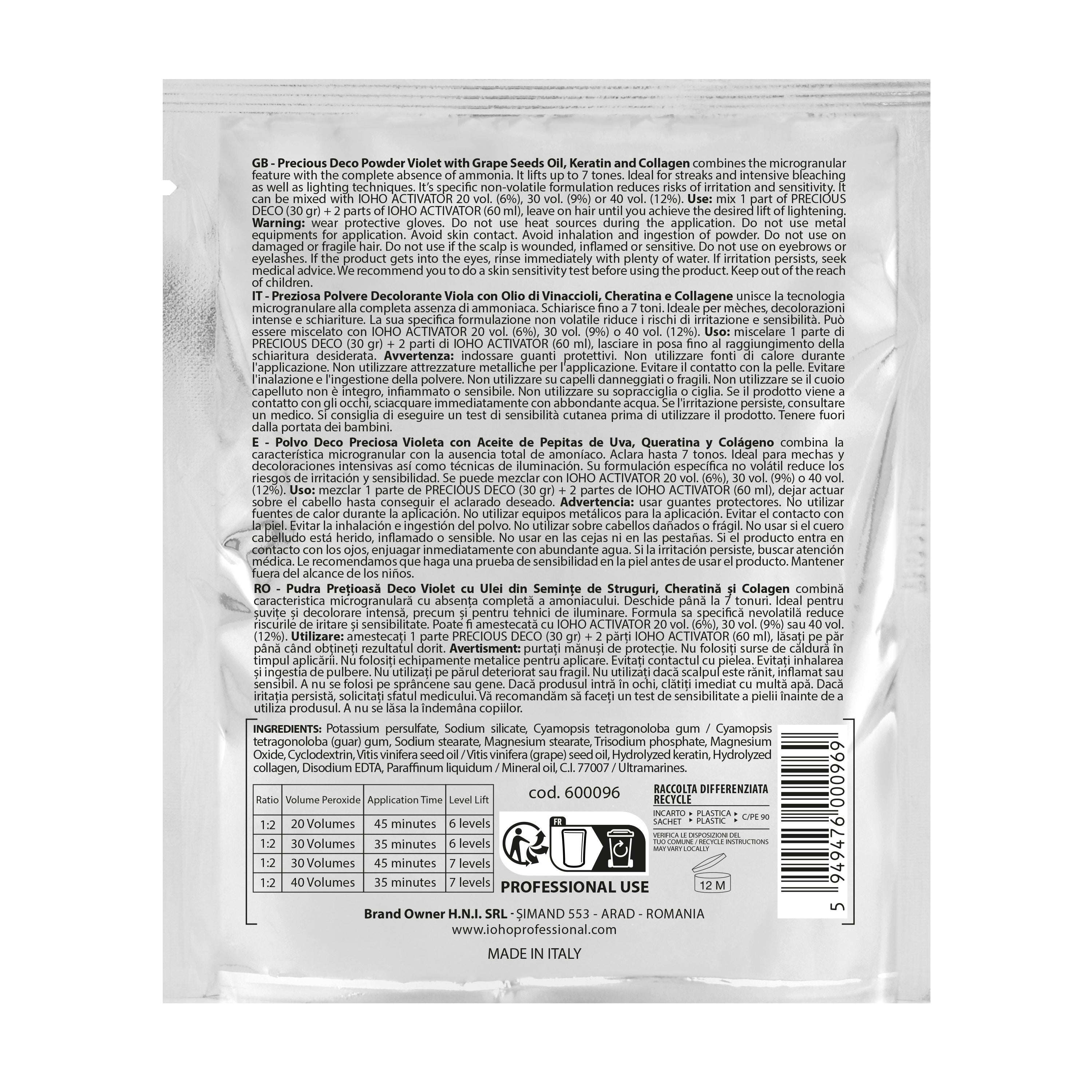 How to use: Mix 1 part Precious Deco (30 gr) + 2 parts Ioho Activator (60ml) leave on the hair until you get the desired result.