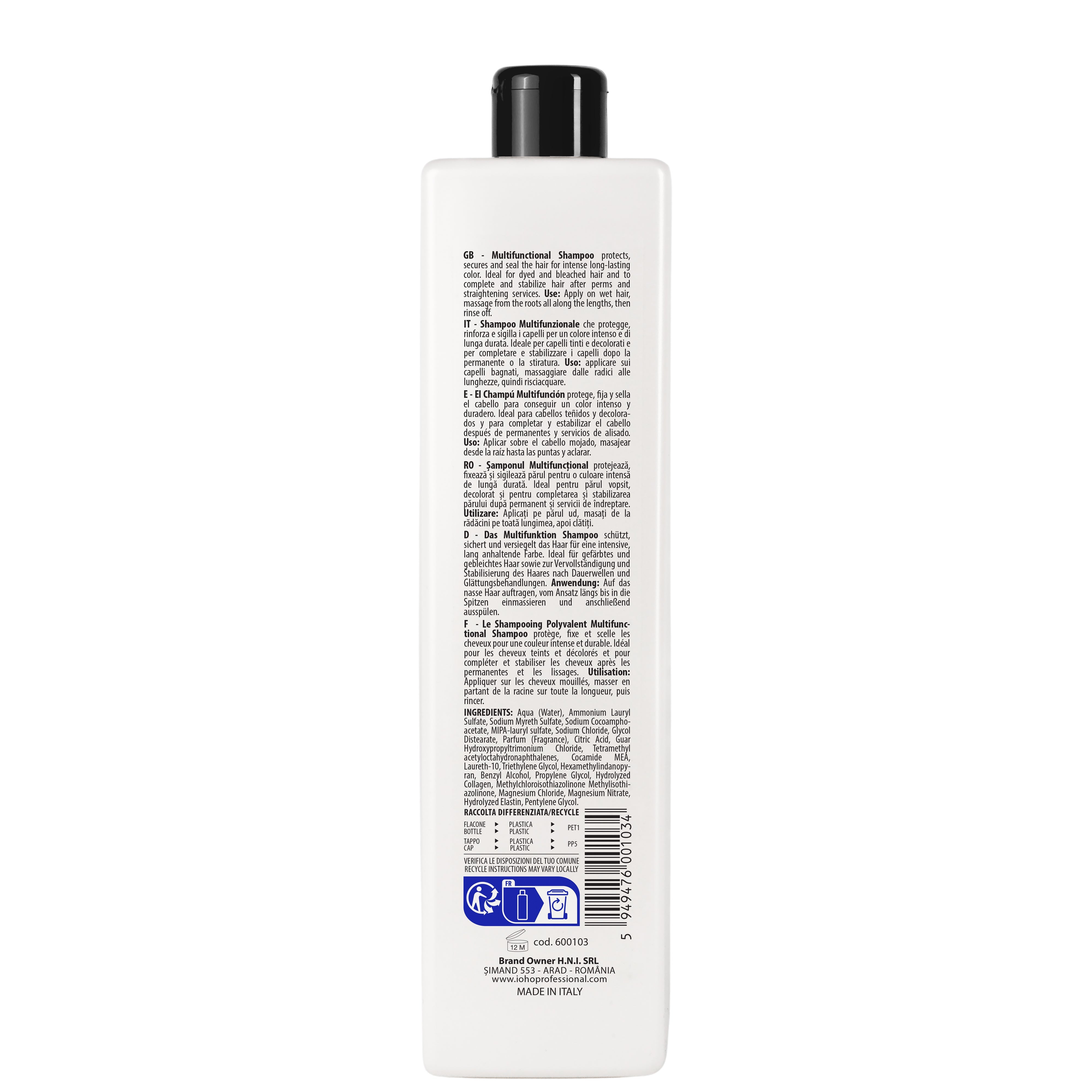 Discover the benefits of the Multifunctional Hair Repair Shampoo, specially created to protect, fix and seal the hair color, giving it a long-lasting intensity. Its innovative formula, enriched with collagen and elastin, is ideal for dyed, bleached or chemically treated hair. This shampoo not only repairs, but also stabilizes the hair after perm or straightening services, offering an optimal pH of 4.3-4.8 to maintain the health of the hair fibers. With a light application on wet hair, the shampoo delicately cleans and strengthens the hair from roots to ends.